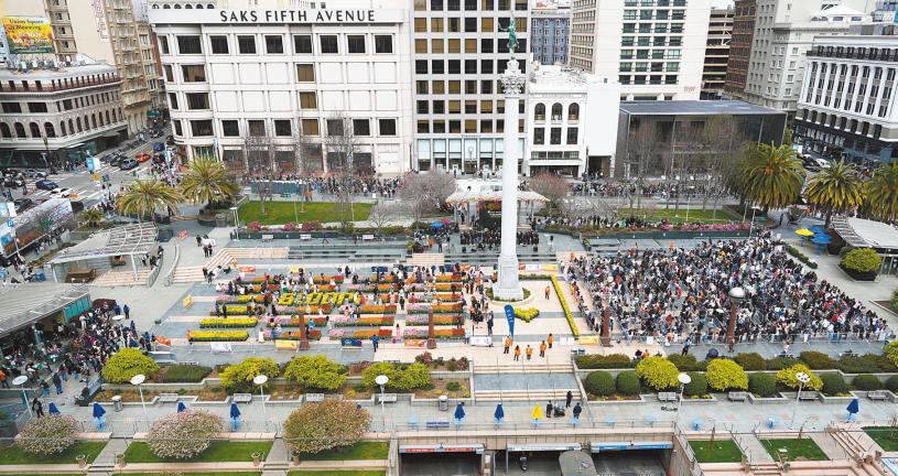 聯合廣場變成一個鬱金香花園,盛開的80,000株荷蘭鬱金香均產自美國。早上8時許,已有市民、遊客聚集,到中午時分,排隊人數已過數千,人龍圍著聯合廣場,延伸到Post街和Sutter街,依然興致勃勃。當中有頭髮花白的長者,也有親情綿綿的年輕情侶,眼中都充滿著期待。