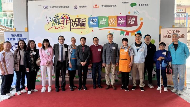 由油尖旺區撲滅罪行委員會、旺角警區及油尖旺民政事務處聯合策劃,在旺角警署門外創作「滅罪防騙壁畫」,今天舉行收筆禮,希望防騙壁畫成為旺角區新打卡點並增加居民歸屬感。
