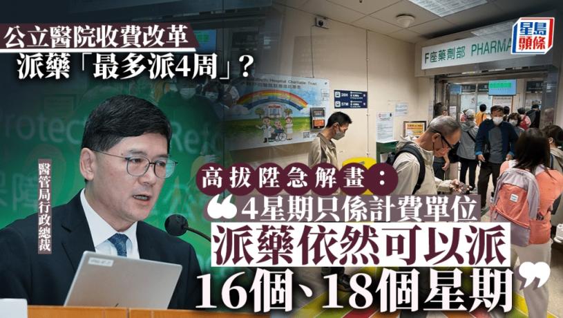 政府昨日公布公立醫院收費改革詳情,其中一項內容,為專科門診及家庭醫學門診藥費日後改為「最多4星期」,每項收費分別為20元和5元。有關說法引起網上關注,病人是否需要每4星期到醫院拿一次藥,製造不必要麻煩。