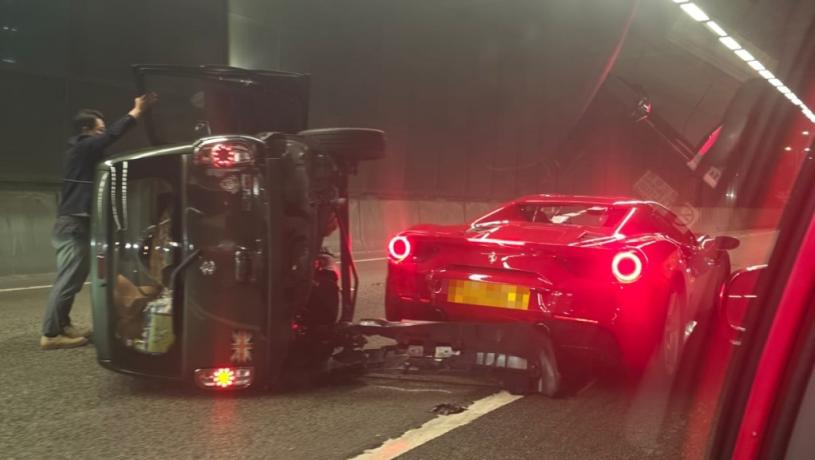 現場為觀塘繞道往將軍澳方向近麗昌花園對開,法拉利跑車載有男司機及一名乘客,正快線行駛;黑色鈴木私家車車上有一名男司機及其太太,當時正沿中線行駛。據了解,兩車駛至上址時突然有車切線,兩車隨後發生相撞,鈴木私家車打兩個筋斗後翻側。法拉利及鈴木私家車的乘客均受傷,其後由救護員送院治理。