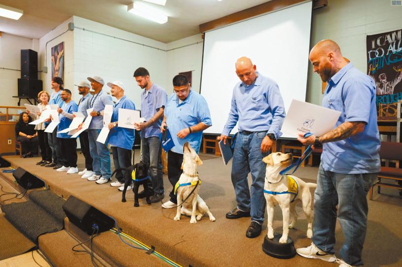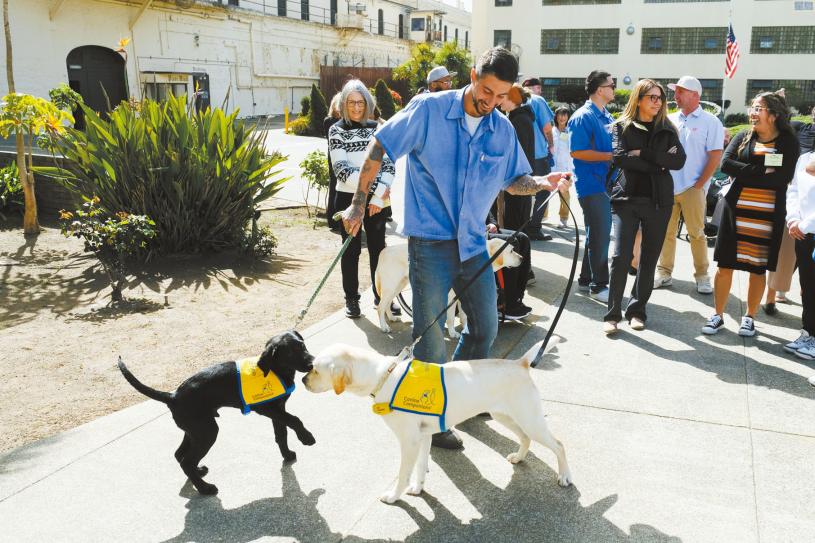 在聖昆汀州立監獄,當兩隻黑色拉布拉多犬與幫助它們成為服務犬的囚犯重聚時,擁抱、眼淚、吠叫和搖尾聲此起彼落。