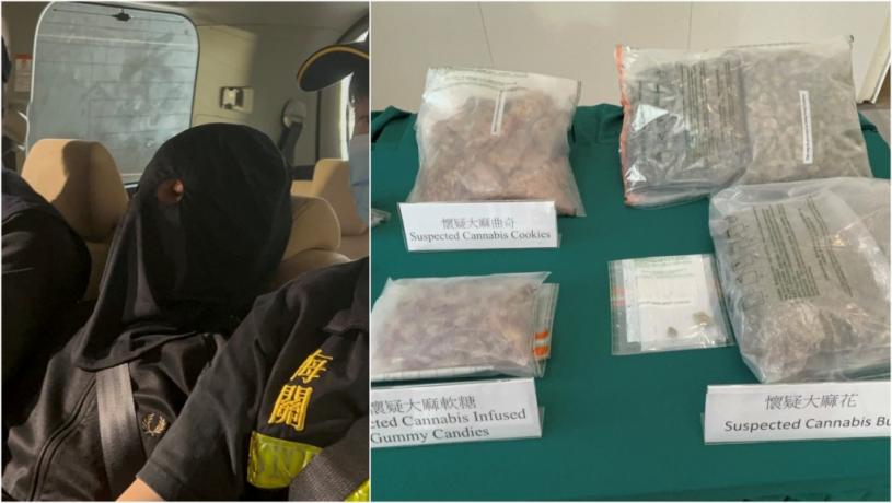 海關毒品調查科人員昨日在大埔區沙埔仔村,截查一名20歲本地男子,在其褲袋中發現2克懷疑大麻花,遂將其拘捕。其後關員押解被捕人到附近一村屋單位搜查,再發現約3.3公斤懷疑大麻花、約1.7公斤懷疑大麻曲奇、約900克懷疑大麻軟糖、約700克懷疑大麻油、515粒懷疑大麻油煙彈、約100支懷疑含有四氫大麻酚的電子煙、120粒懷疑搖頭丸,以及一批毒品包裝工具。