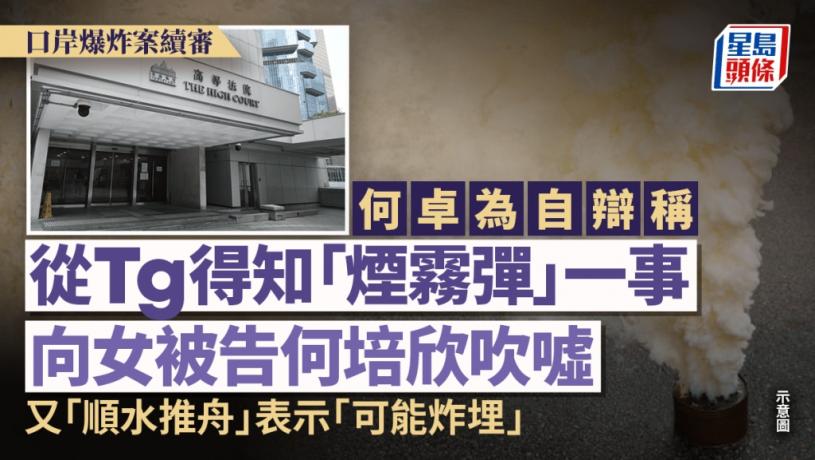 8男女涉2020年初口岸爆炸案,今於高等法院踏入第89天審訊。首被告何卓為續自辯,他於明愛醫院爆炸案前一日曾向同案被告何培欣發送Telegram訊息,表示自己「我聽晚都有行動」,何培欣問到「煙霧彈?」,何卓為則回覆「可能炸埋」。何卓為今供稱,自己當時從示威群組得知有人計劃放置「煙霧彈」,並曾向何培欣吹噓此事,當何培欣問起「煙霧彈」時,他更「順水推舟,再講大啲」,所以才回覆「可能炸埋」。
