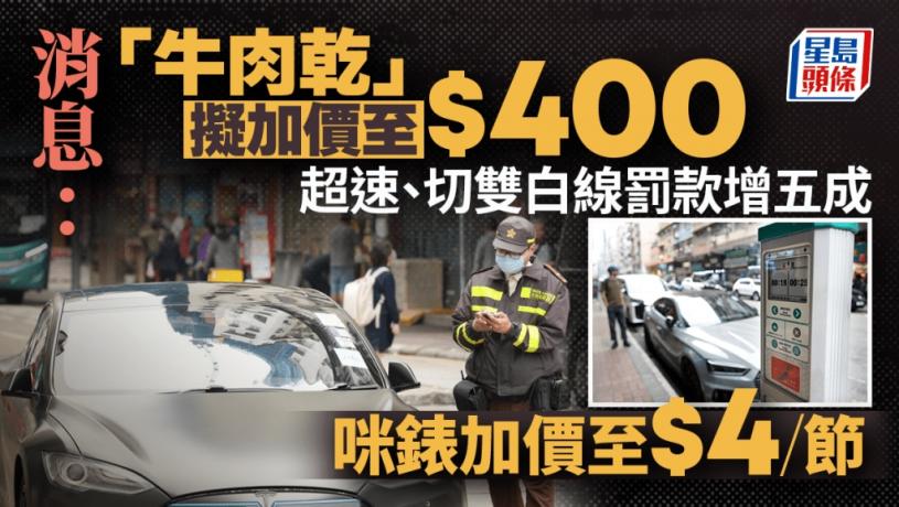最新一份財政預算案提到將檢討交通違例事項的定額罰款,以更好管理交通。消息指,政府擬將違泊「牛肉乾」由320元加至400元;超速罰款增五成,下周交立法會討論。消息亦指,政府擬將私家車停車收費錶,由每節2元上調至每節4元,貨車、巴士旅遊巴收費不變。同時當局計劃上調逾10項違反交通規則,如超速、切雙白線等的項目罰款5成。