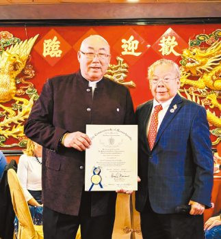 (右起)黃子安議員給司徒宗達頒發麻州眾議院的嘉獎狀。