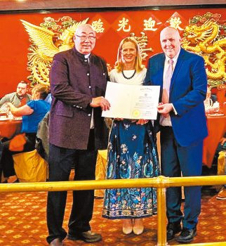 (右起)費連議員、墨菲議員給司徒宗達頒波士頓市議會的嘉獎狀。