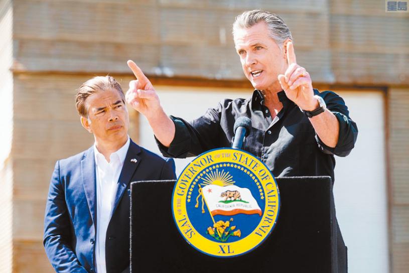 紐森16日在斯坦尼斯勞斯縣(Stanislaus)瑟里斯(Ceres)一處杏仁農場召開記者會,與州檢察長邦塔(Rob Bonta)一同宣布狀告特朗普。紐森表示,關稅對加州造成的損失比其他任何一個州都要高。