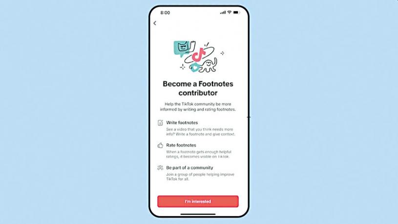 短視頻程式TikTok宣布推出新服務,對其平台上內容展開事實查核。這項服務稱為「註腳」(Footnotes),由網民為該平台的短片增加「更多背景內容」,與社交平台X的「社群筆記」(Community Notes)功能類似。