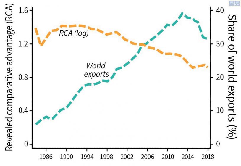 20世紀90年代和21世紀,中國取了代低成本製造業的「亞洲四小龍」——香港、新加坡、韓國和台灣。中國佔世界製造業出口的份額從1990年的2.8%上升至2015年的峰值18.5%。中國勞動密集型製造業(如紡織品、鞋類、家具)佔全球出口份額在2013年達到峰值,接近40%,此後回落至32%以下。中國通過開放市場、吸引外資、降低進口壁壘、拆除國家控制的出口體系、整合效率低下的國有企業、放鬆國內移民限制等貿易相關改革,推動了其崛起為製造業強國。中國加入世貿組織、納入全球供應鏈,也是推動因素之一。從1990年到2005年,15.6%的出口成長來自進口關稅降低,8.4%來自外國關稅削減,6.7%來自放寬內部移民壁壘,而69.4%則歸功於技術進步和高技能勞動力等生產率的提高。