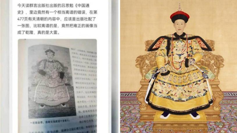 有內地網民近日發視頻反映,其在閱讀群言出版社出版的《中國通史》時,發現書中出現低級錯誤,將乾隆皇帝畫像錯配雍正皇帝的圖片。對此,群言出版社回應,確實配錯了圖,但目前版權已過期,無權再修訂。