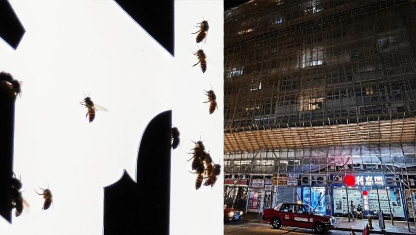 多隻蜜蜂停留在燈箱上。黃文威攝