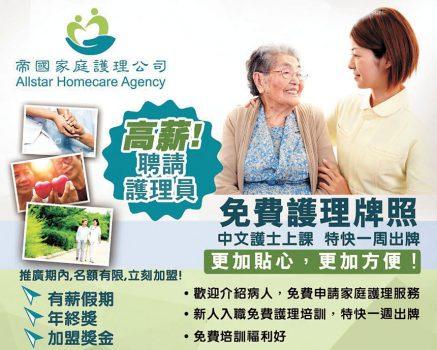 帝國家庭護理公司(ALLSTAR HOMECARE AGENCY, INC.)現正高薪聘請持牌護理員,薪高糧準,有醫療、獎金、交通津貼等福利,工作時間靈活,多工選擇。歡迎帶老人家加入,並免費為老人家申請家庭護理服務。免費為年老體弱或傷殘人士持有白卡或紅藍卡者,均可申請政府免費家庭謢理員,歡迎加入帝國家庭護理公司,成為他們大家庭中溫馨和快樂的一員吧!