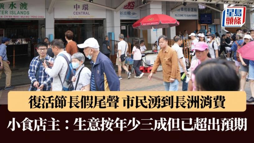 復活節長假來到最後一日,《星島頭條》記者今日(21日)來到長洲,觀察遊客及港人留港消費的情況。現場可見有不少市民選擇「抓緊假期的尾巴」,入長洲一日遊,其中不乏帶小孩享受天倫樂的家庭。有市民和遊客希望品嚐糯米糍、大粒魚蛋小食,有小食店東主指,今年生意雖然按年少三成,但原本預期會更差,如今狀況已比預期好近一半。