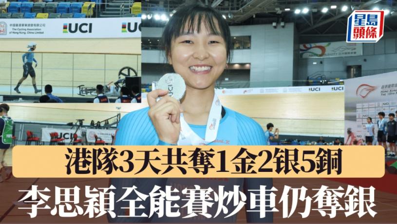 一連3日在香港單車館進行的「香港單車盃暨全運會測試賽」周一完成,隊中主力李思穎在最後一項「全能賽」的80圈記分賽中,雖然中途被連累「炒車」,但仍取得一面銀牌,真的說到做到,比第一天的銅牌「換了顏色」,個人共取1銀2銅,連同男子捕捉賽的伍柏亨驚喜奪金,港隊3日擸走1金2銀5銅共8面獎牌。