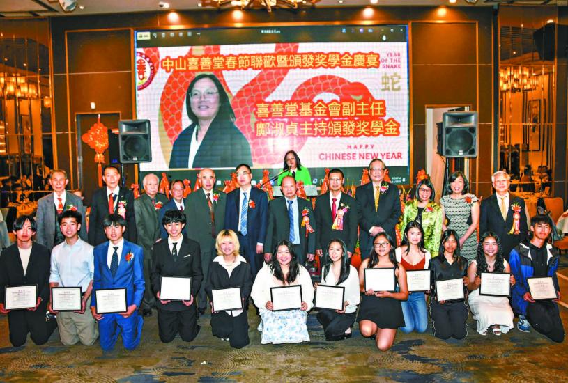 ( 特約僑社記者譚國亮報導 )中山喜善堂春節聯歡慶會暨獎學金頒發典禮,於4月13日晚上6時在南三藩市半島豪苑隆重舉行。中領館領僑處主任王一嗚、領事姚瑤;市長羅偉代表梁莉娜、市參事陳小焱、州\u8846議員楊馳馬代表Susan Chen、市參事李爾德代表方國宗;中華會館代總董余健峰;陽和總會館主席陳國慶; \u9061源堂主席雷振澤及原宗主席鄺炳威;秘書黃漢傑;義安堂主席盧偉棠;同善堂主席陳舉雄;積善堂副主席阮桂康;集善堂主席梁仕\u52f2、副主席梁華樹;德善堂主席陳展明、副主席洪順祥;東莞寶安堂主席李滔;副主席郭海波;美國莞商會主席何富明、副會長吳軍;中中同學會會長蕭健榮、副會長林鳳敏;劉族建福宗親會會長劉應宗、副會長劉鐵銘;\u987a德行安堂主席黃志沖; 北京同鄉會會\u957f何孔華; 喜善堂主席陳家柱、副主席梁志雄;監察長鄺炳威;中文書記黃漢傑、副書記鄺忠英;英文書記鄺冠文、副書記趙一軍;會所財政梁亮球、副財政鄺位富;樓業財政梁欽樂、副財政陳德盛;核數陳耀宗、副核數\u9ec4堅松;監察委員鄺英大、張卓逢、吳忠安、梁浩業;陳國男基金會主任陳嘉慧,喜善堂基金會主任梁欽樂、副主任鄺淑貞、書記鄺振豪、財政鄺挺世、顧問陳國男夫人以及各僑團首長、嘉賓、鄉親、學生暨家長逾800多人出席慶會。中文書記黃漢傑主持慶會程序,在中美國國歌聲中為慶會拉開帷幕。主席陳家柱致歡迎詞表示: 謹代表喜善堂全體同仁向嘉賓表示熱烈的歡迎和充心的感謝!他續說:喜善堂一年一度的新年春宴,以及頒發獎學金的慶會,今年的宴會是近幾年來宴會中最多會員踴躍參加的一次,所以宴會要設席兩間餐館:半島豪苑和蕭湘館,共80席,從中體現出本善堂會員對我們喜善堂數年來的運作和堂務充滿著信心、肯定和支持!今年我好榮幸被喜善堂的會員和理事推選為喜善堂主席,我將在任職期間會盡最大的努力去履行主席的所有職責和義務!盡力做到尊敬前輩,尊重和團結每一位理事,虛心向各位有經驗的前輩學習和請教,遵守本善堂的章程, 行事以章程為基礎和結合理事會\u51b3議為準則,積極帶領和協助本善堂的職員和理事搞好堂務工作,達到友愛友好的社團,努力讓我們喜善堂的慈善基金會與陳國男獎學基金會相互融洽,為喜善堂繼續發光發亮。 中領館王一嗚主任致詞: 非常高興參加喜善堂春節聯歡宴會和獎學金頒獎典禮,謹代表中領館表示熱烈的祝賀。中山喜善堂歷史悠久,會務昌隆,人才濟濟,長期為僑社團結,促進中美交流作出貢獻,特別在2003年6月升起了五星紅旗,當時在僑社具有深遠的影響,我對你們表示崇高的敬意,他指出,近日來美國對包括中國政府在內的全體貿易夥伴貿易關稅,引發其全球的關注使到近來的物推高物價,這對美國經濟和美國民\u8846幾乎沒有任何好處,希望得到明智選擇解\u51b3,中美友好繼續發展,友好往來。