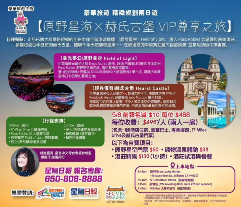 由豪華假期主辦,星島中文電台、星島日報、華埠訪客中心媒體贊助的【原野星海 × 赫氏古堡 VIP 尊享之旅】兩日遊,期待您的參與。5月8日前報名,還可享受每位減$10的優惠,不要錯過。報名專線:(650)808-8888。