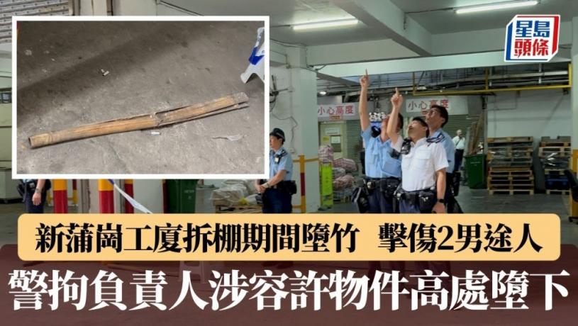 新蒲崗大有街14號正進行拆棚工程,今(26日)早上近10時,棚架工人報案指有竹枝意外墮下,擊中兩名男途人,其中一人頭部流血,仍然清醒,另一人則胸口痛。警員接報到場,將受傷二人送院敷治,警方圍封案發現場,經調查後拘捕姓楊(47歲)公司負責人,涉容許物件從高處墮下。