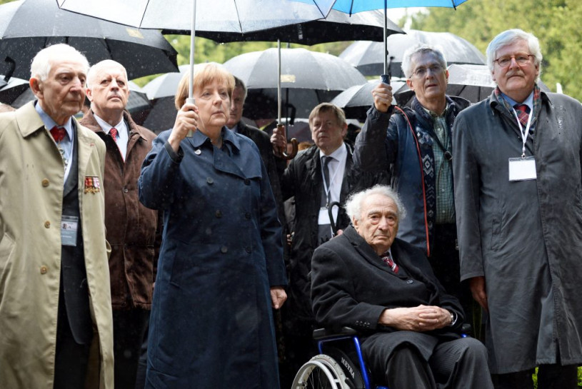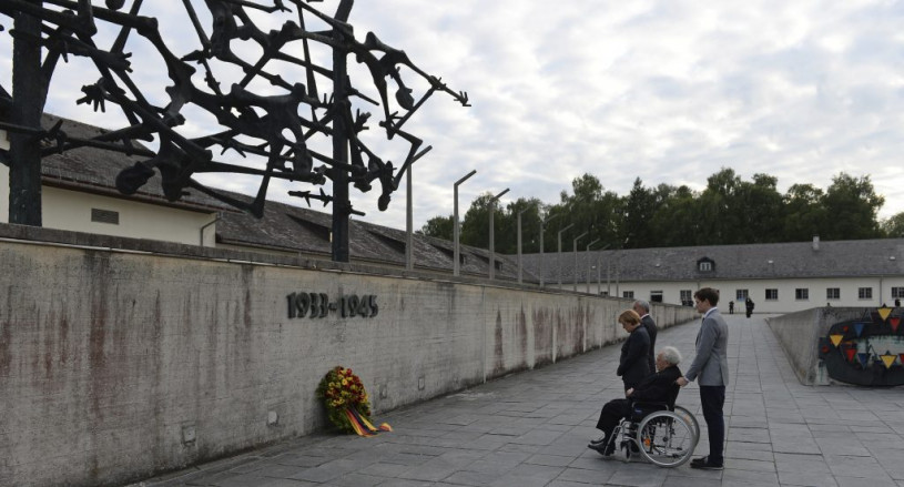 2013 年 8 月 20 日,當年的德國總理默克爾在訪問位於德國南部的達豪納粹集中營期間出席了獻花圈儀式。坐在輪椅上的是集中營里曾經的囚犯馬克斯•曼海默。曼海默於 1945 年被美國士兵從達豪解救。美聯社