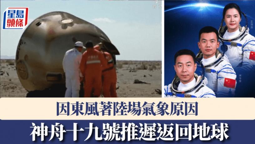 據新華社報道,中國載人航天工程辦公室消息,因近日東風著陸場氣象條件不滿足任務要求,為確保太空人(內地稱航天員)生命健康安全和任務圓滿成功,經研究決定,原計劃4月29日實施的神舟十九號載人飛船返回任務將推遲進行,於近日擇機實施。