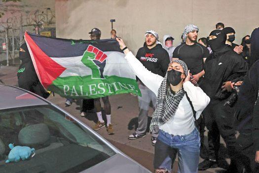 數十名支持巴勒斯坦示威者,在布碌崙宗教組織「查巴德盧巴維奇世界總部」(Chabad Lubavitch World Headquarters)外面集會,抗議數百名支持以色列的示威者上星期包圍一名女子並對她大聲辱罵。