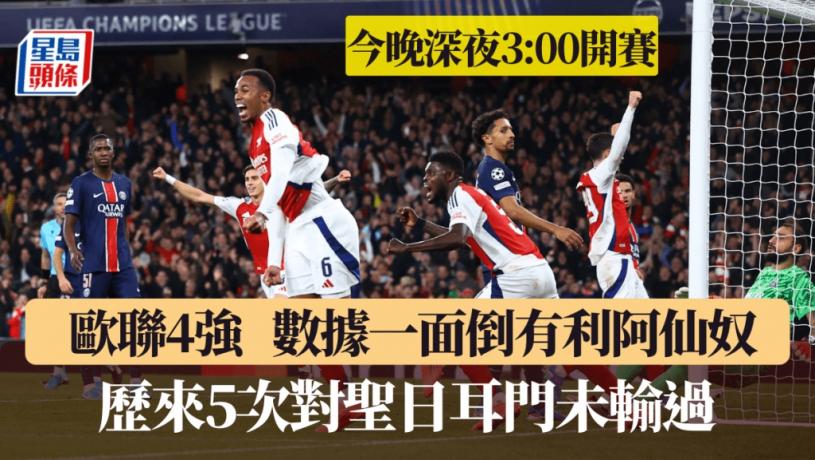 歐聯4強大戰今晚展開,阿仙奴打頭陣在首回合主場鬥巴黎聖日耳門。聖日耳門過去兩圈分別淘汰另外兩支英超球隊利物浦和阿士東維拉晉級,實力上有一戰之力,但他們在數據上就全面處下風,過去5次與阿仙奴交手不勝,加上近6次歐聯造訪英格蘭球隊輸了其中5場,往績對他們不利。
