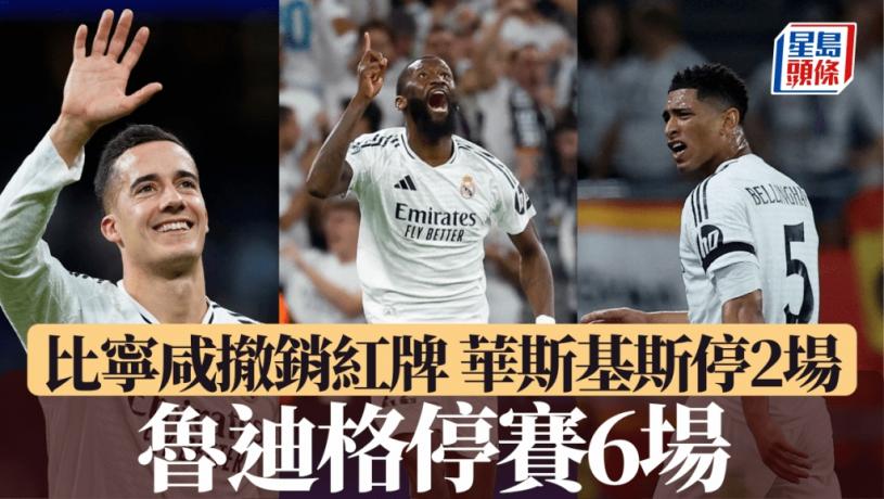 西班牙足周二公布對西班牙盃決賽末段領紅牌的皇家馬德里球員作出處罰,後衛魯迪格停賽6場、魯卡斯華斯基斯停賽2場,中場祖迪比寧咸的紅牌獲撤銷。連同費蘭特文迪和阿拉巴兩名傷兵,皇馬後防3人提早收咧,後防鬧嚴重兵荒。