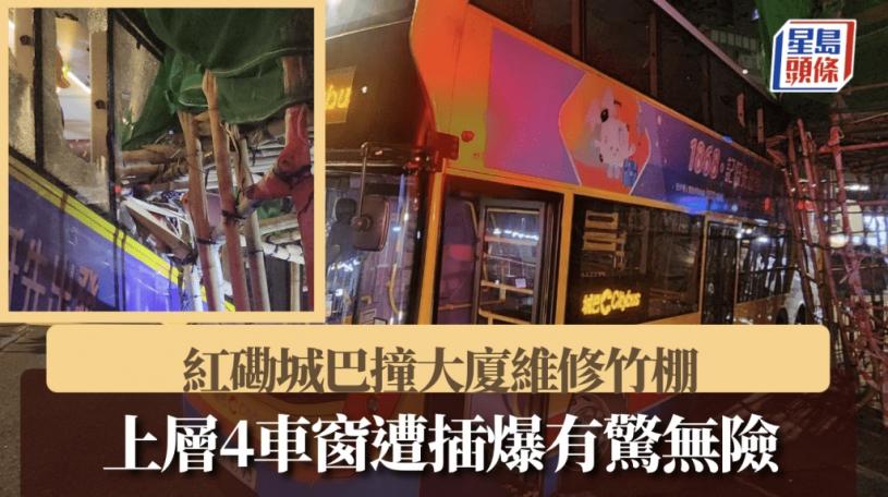 紅磡發生城巴撞大廈棚架意外。昨日(30日)晚上11時許,一輛城巴沿馬頭圍道左轉入蕪湖街期間,疑「攞位」不足,撞上轉角一棟大廈外牆的維修棚架,上層車窗遭竹枝插穿,幸未有造成乘客受傷。