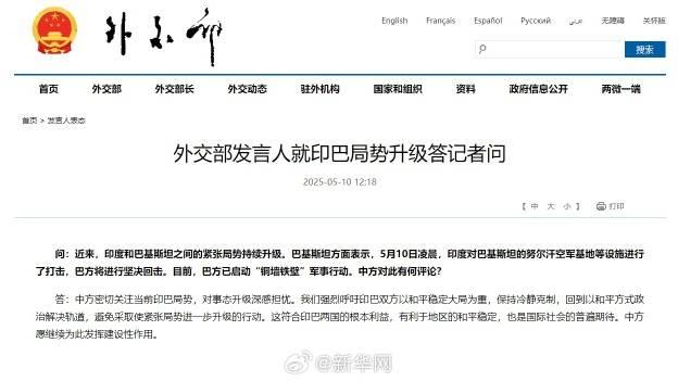 巴基斯坦方面表示,5月10日凌晨,印度對巴基斯坦的努爾·汗空軍基地等設施進行了打擊,巴方進行「銅牆鐵壁」軍事行動還擊。就印巴局勢升級,外交部發言人今天(5月10日)表示密切關注當前印巴局勢,對事態升級深感擔憂。強烈呼籲印巴雙方以和平穩定大局為重,保持冷靜克制,回到以和平方式政治解決軌道,避免採取使緊張局勢進一步升級的行動。這符合印巴兩國的根本利益,有利於地區的和平穩定,也是國際社會的普遍期待。中方願繼續為此發揮建設性作用。