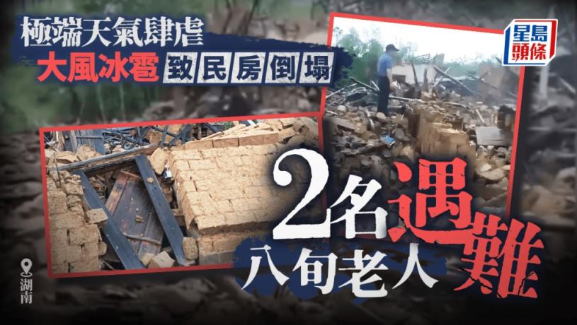 湖南衡陽祁東縣昨日(5月8日)遭遇罕見大風冰雹強對流天氣,步雲橋鎮坪塘村一民房倒塌,兩名八旬老人被埋。據百姓關注,兩位老人被救出時已無生命跡象。當地氣象部門8下午曾發布雷雨大風橙色預警,提示可能出現龍捲風。步雲橋鎮政府一名工作人員表示正在核查災情相關情況,並同步展開後續處置工作。