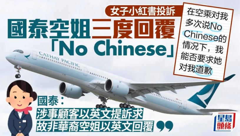 再有網民在小紅書指控國泰空姐。一名女子前日(9日)在小紅書發文,投訴在國泰航班上遭歧視。事主稱自己於4月29日搭乘國泰紐約飛香港的班機,因為調較座椅而遭後排乘客踢椅背,她用英文向空姐說明情況並要介入協助,惟對方竟連續三次回覆:「No Chinese」並拒絕協助,直至事主調高音量說「我在跟你講英文!」空姐始回覆沒法處理,幾經交涉後,事主終獲更換了一個無法充電的座位,事件令事主感到莫大的侮辱和歧視。