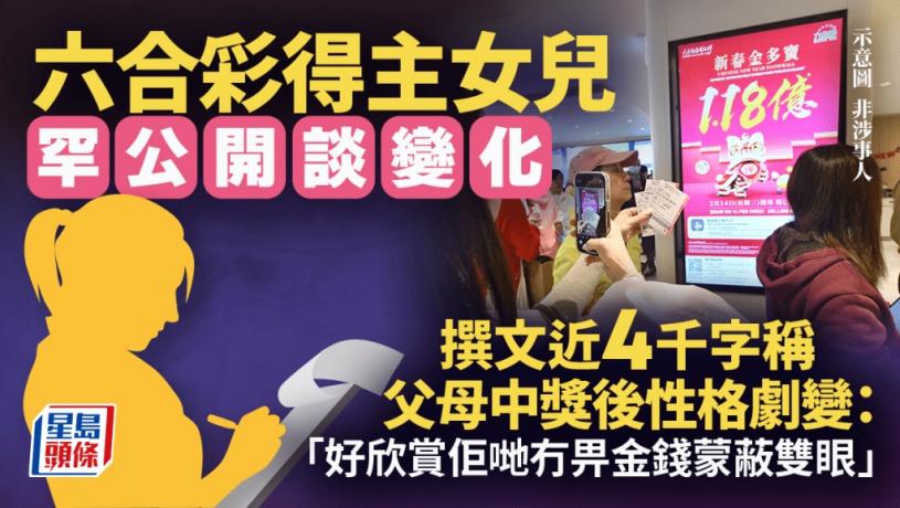 六合彩得主女兒罕公開談變化 撰文近4千字稱父母中獎後性格劇變:「好欣賞佢哋冇比金錢蒙蔽雙眼」↓↓↓↓