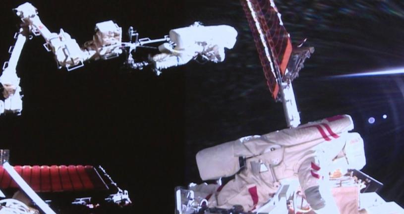 陳冬(左)與王傑在艙外工作的畫面。 新華社