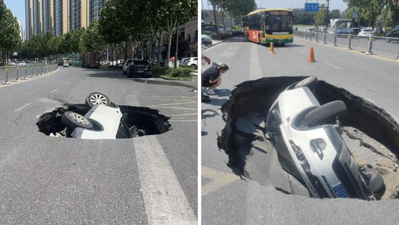 合肥道路突塌陷吞沒越野車。抖音@梁明