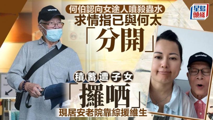 因與何太互毆再獲全城關注的何伯,涉嫌於今年5月在屯門兆康站與婦人爭執後,向對方噴射殺蟲水。何伯今於屯門裁判法院承認襲擊罪,其律師代表求情指何伯與何太上東張西望節目後常遭陌生人指指點點及說閑話,婦人當日以手機拍攝何伯何太,又突然罵他們為「過街老鼠」,何伯被激怒才拿殺蟲水噴射婦人。何伯現時已與何太分居,目前居於安老院,依靠綜援維生,冀法庭判罰款。署理主任裁判官鄧少雄先為何伯索取感化報告,強調仍保留判監選項,將於10月21日判刑。