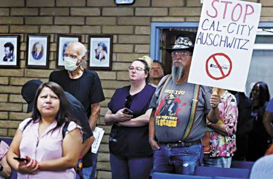 民眾在市議會上排隊等候評論,手舉反對標語。洛杉磯時報
