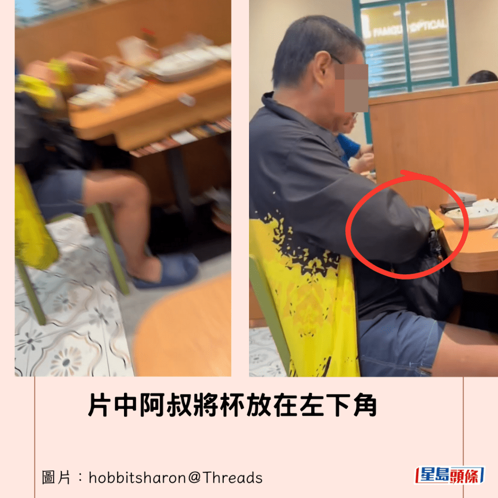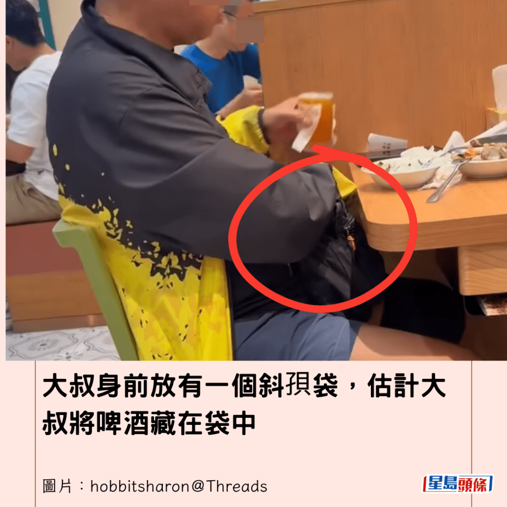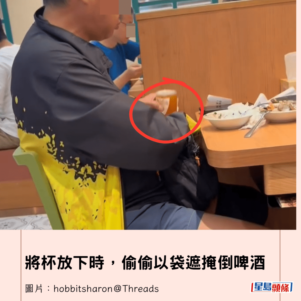 大叔身前放有一個斜孭袋,估計大叔將啤酒藏在袋中,將杯放下時,偷偷以袋遮掩倒啤酒,大叔與一名女士同枱,該女士坐在對面,影片見女士面對此情況「零反應」,未有任何反應。