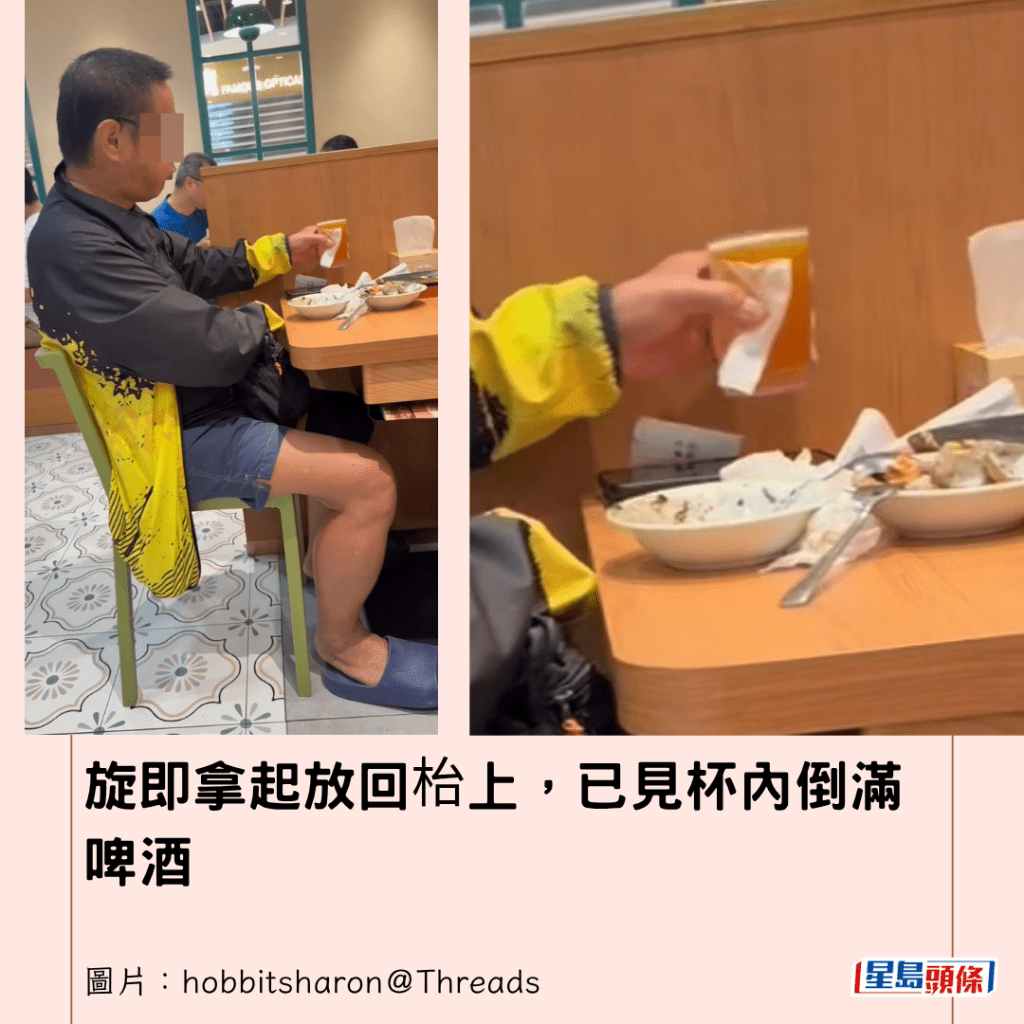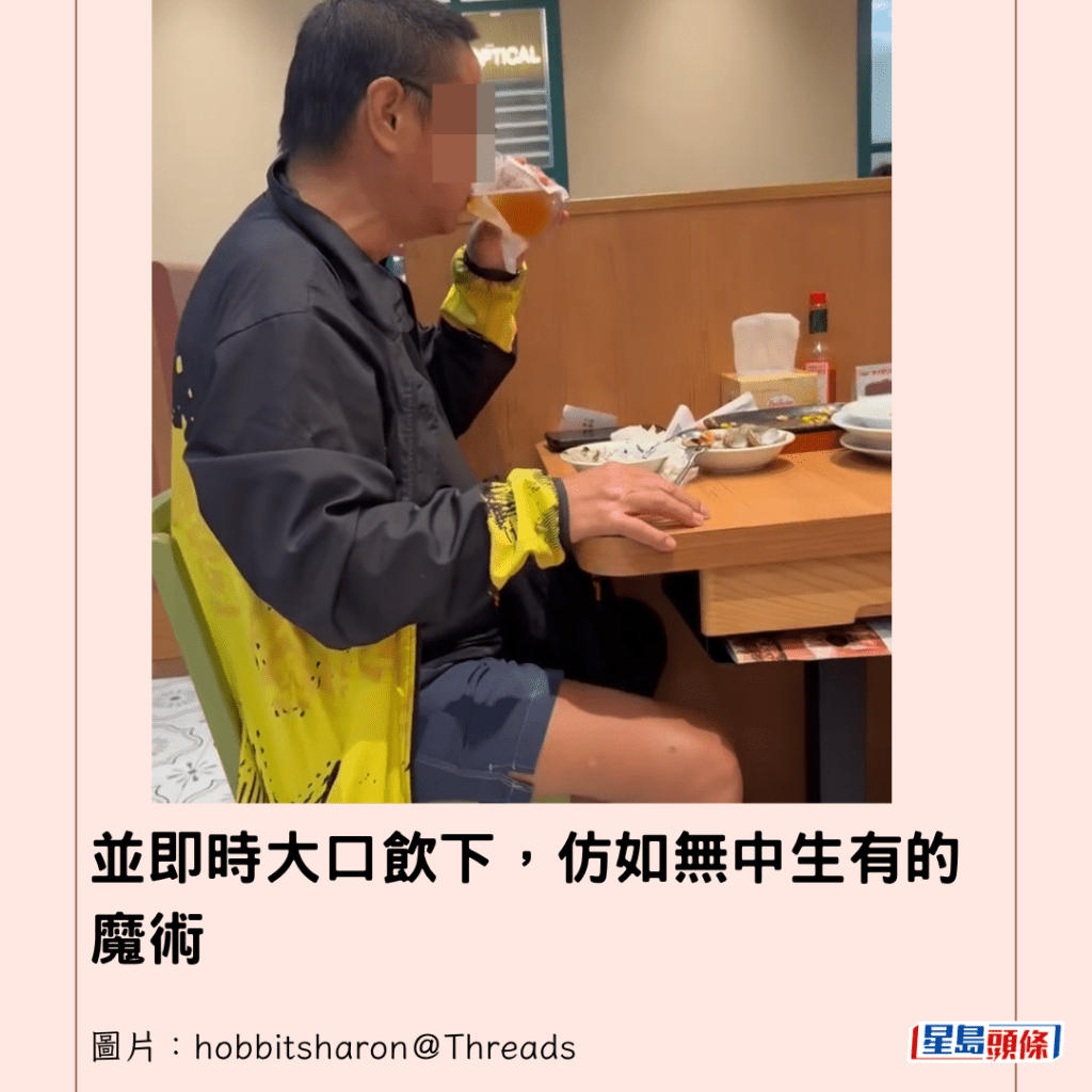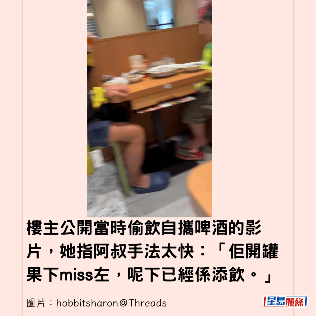 樓主公開當時偷飲自攜啤酒的影片,她指阿叔手法太快:「佢開罐果下miss左,呢下已經係添飲。」片中阿叔將杯放在左下角,旋即拿起放回枱上,已見杯內倒滿啤酒,並即時大口飲下,仿如無中生有的魔術。