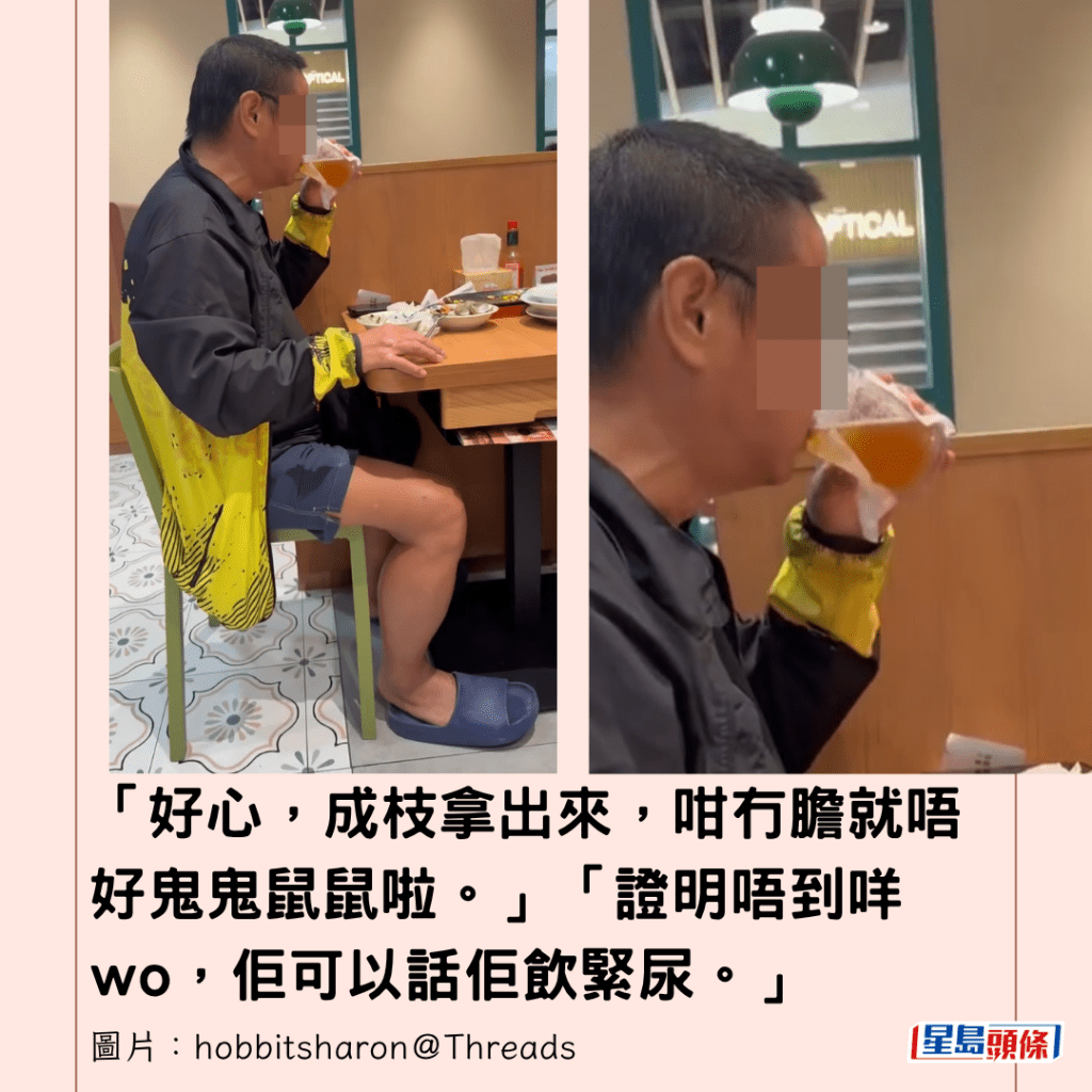 不少網民留言冷嘲熱諷揶揄大叔缺德行為:「果個係尿袋,佢拎出嚟飲,中醫治療法。」「是但喇,成日都有人帶嘢飲入戲院,香港人本色。」「好心,成枝拿出來,咁冇膽就唔好鬼鬼鼠鼠啦。」「證明唔到咩wo,佢可以話佢飲緊尿。」