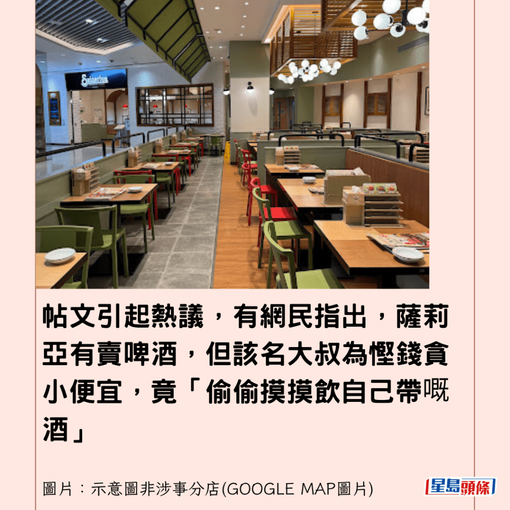 帖文引起熱議,有網民指出,薩莉亞有賣啤酒,但該名大叔為慳錢貪小便宜,竟「偷偷摸摸飲自己帶嘅酒」,