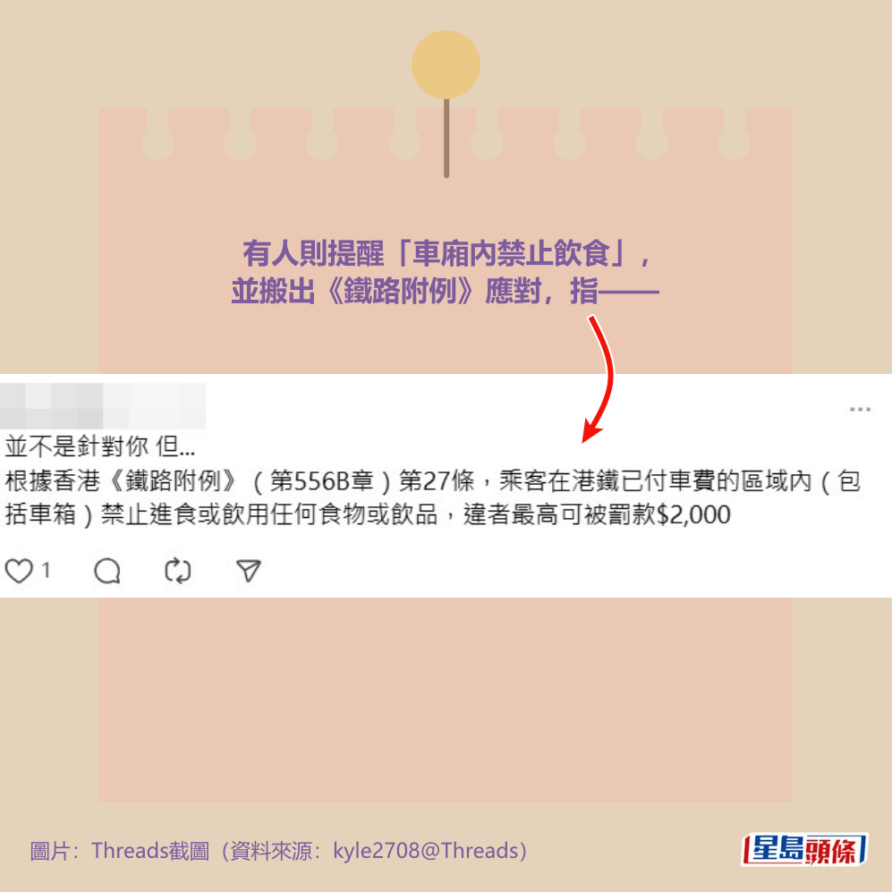 有人則提醒「車廂內禁止飲食」,並搬出《鐵路附例》應對,指「根據香港《鐵路附例》(第556B章)第27條,乘客在港鐵已付車費的區域內(包括車箱)禁止進食或飲用任何食物或飲品,違者最高可被罰款$2,000」。