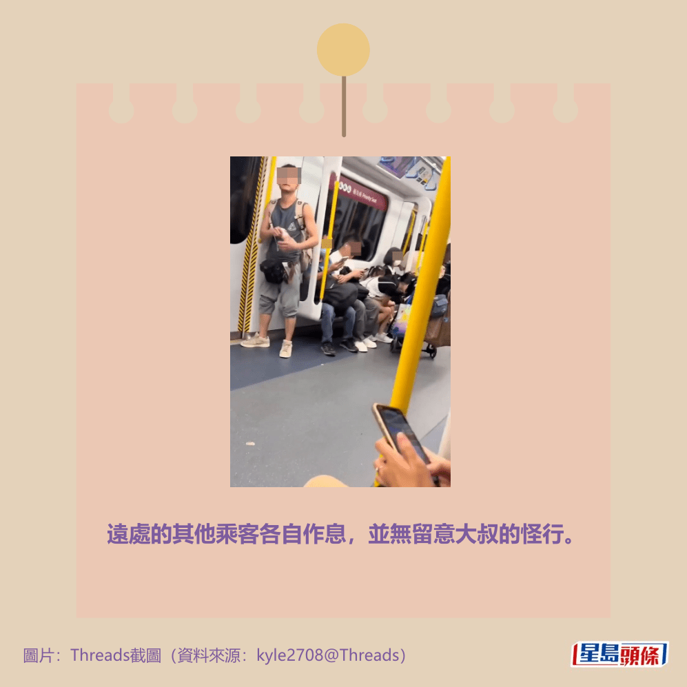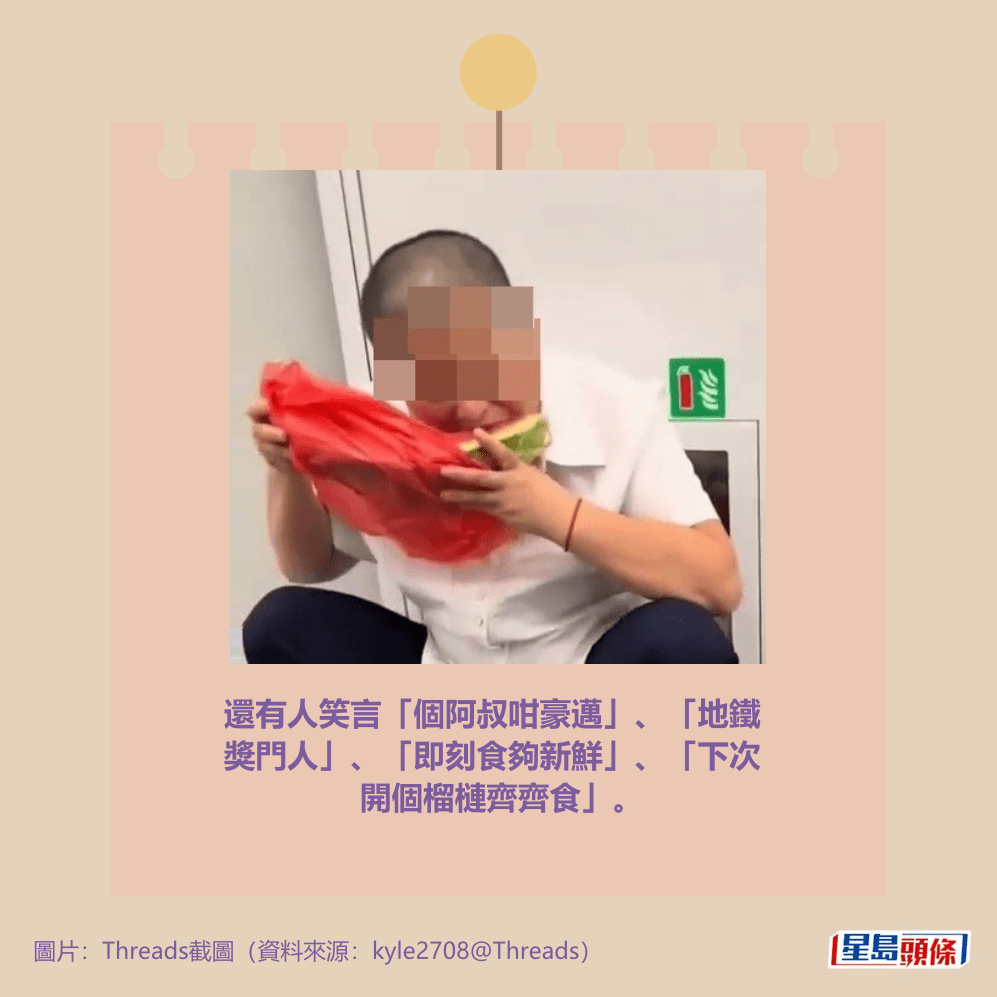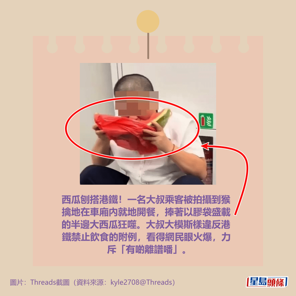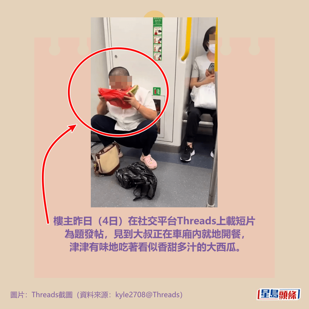 樓主昨日(4日)在社交平台Threads上載短片為題發帖,見到大叔正在車廂內就地開餐,津津有味地吃著看似香甜多汁的大西瓜。