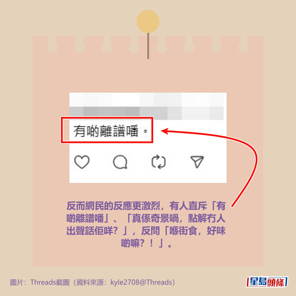 反而網民的反應更激烈,有人直斥「有啲離譜噃」、「真係奇景喎,點解冇人出聲話佢咩?」,反問「喺街食,好味啲嘛?!」;還有人坦言「跨張到我有一秒覺得係AI(人工智能)造出嚟嘅」。