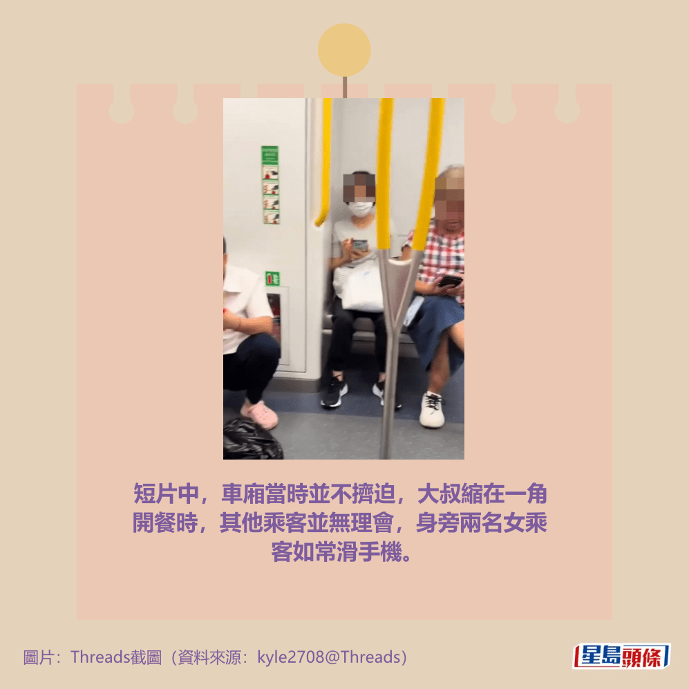 短片中,車廂當時並不擠迫,大叔縮在一角開餐時,其他乘客並無理會,身旁兩名女乘客如常滑手機,遠處的其他乘客各自作息,並無留意大叔的怪行。