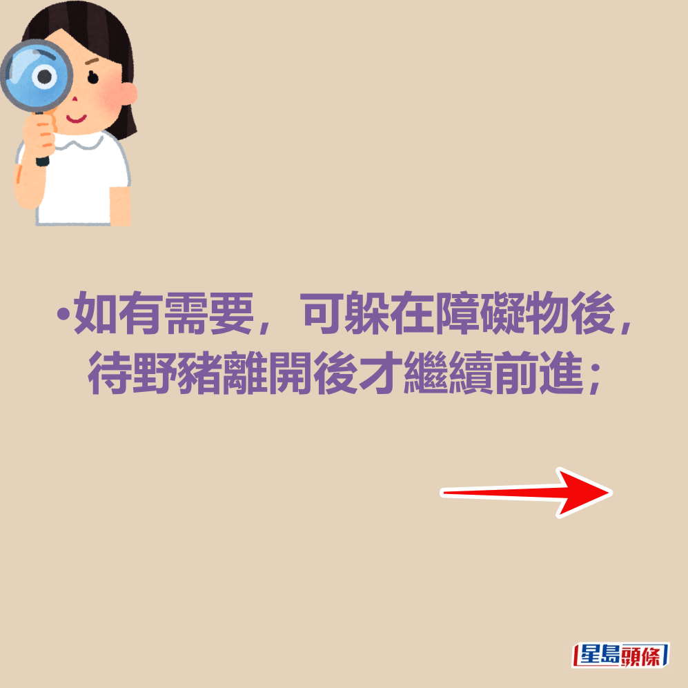 •如有需要,可躲在障礙物後,待野豬離開後才繼續前進;