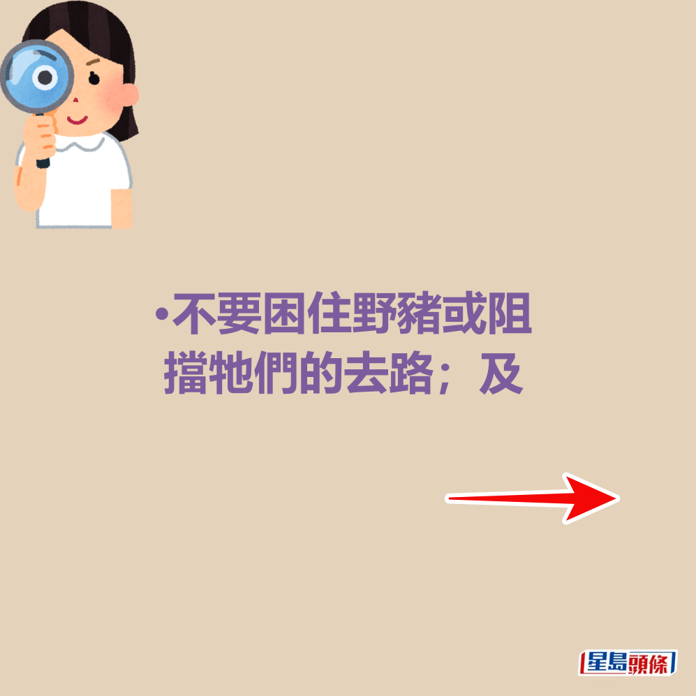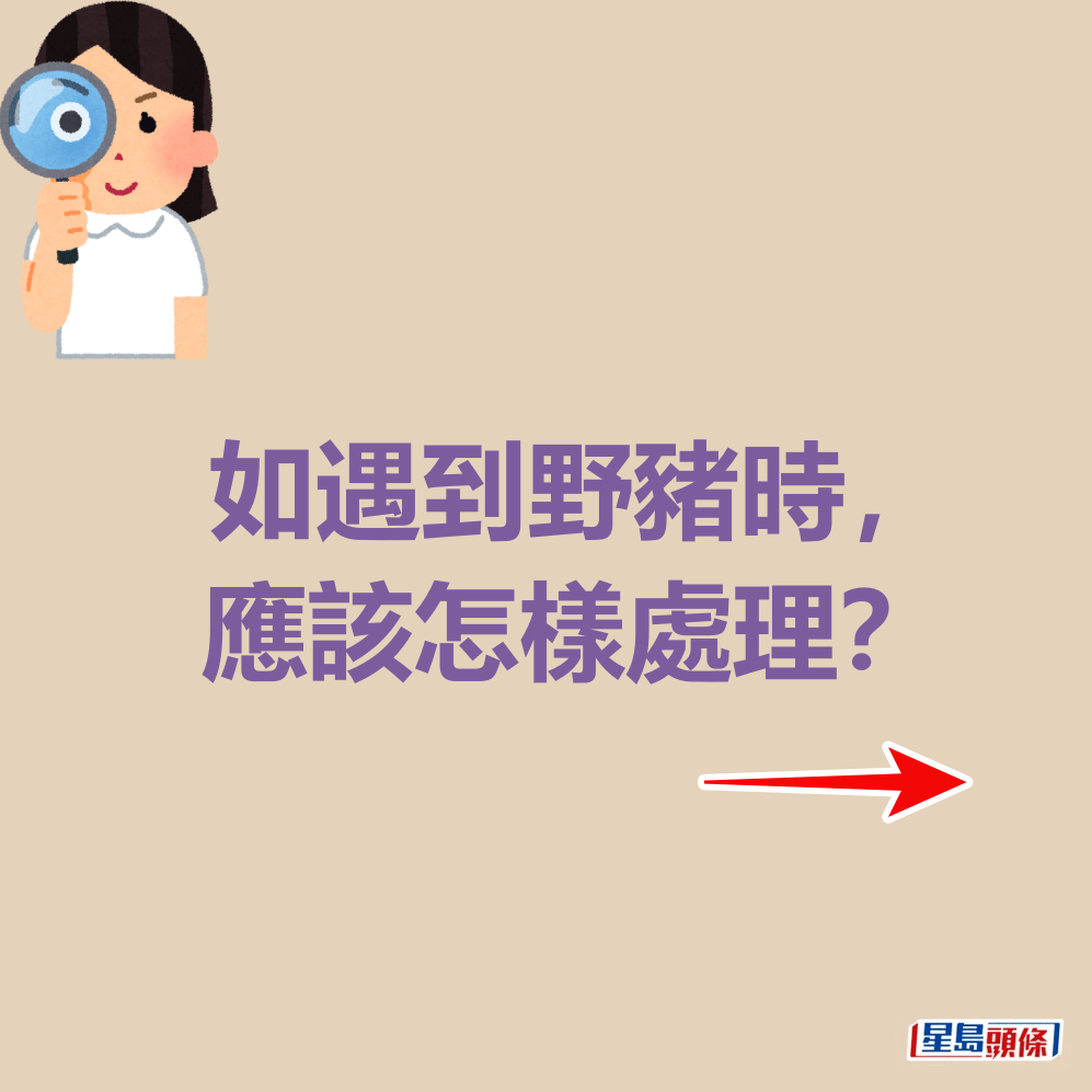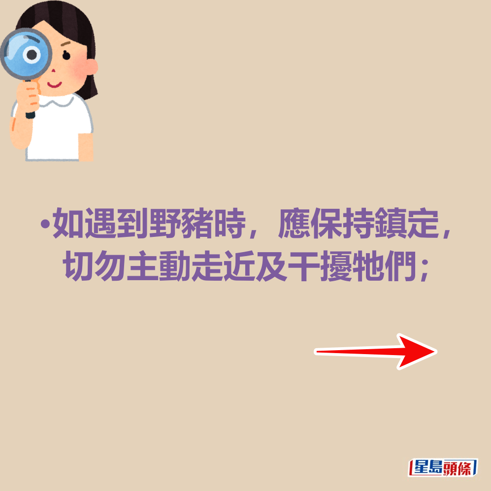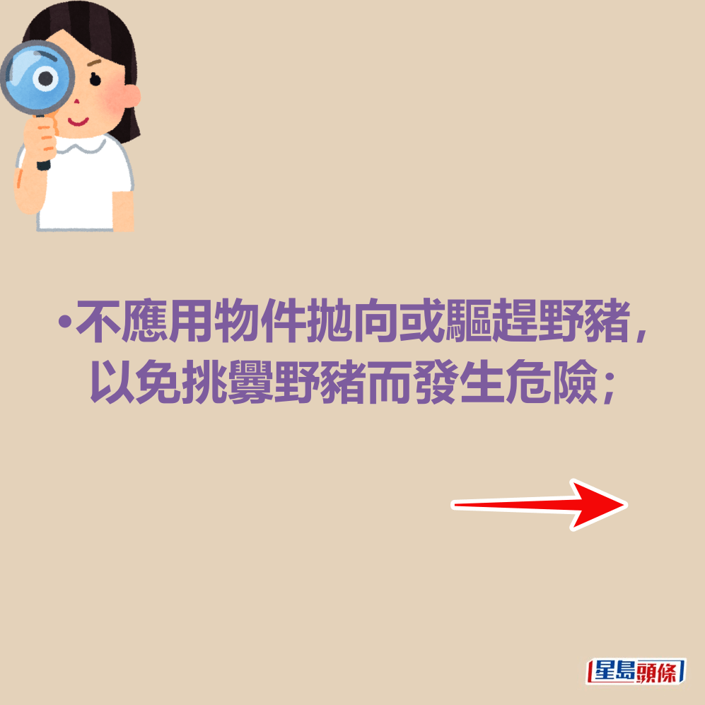 •不應用物件拋向或驅趕野豬,以免挑釁野豬而發生危險;
