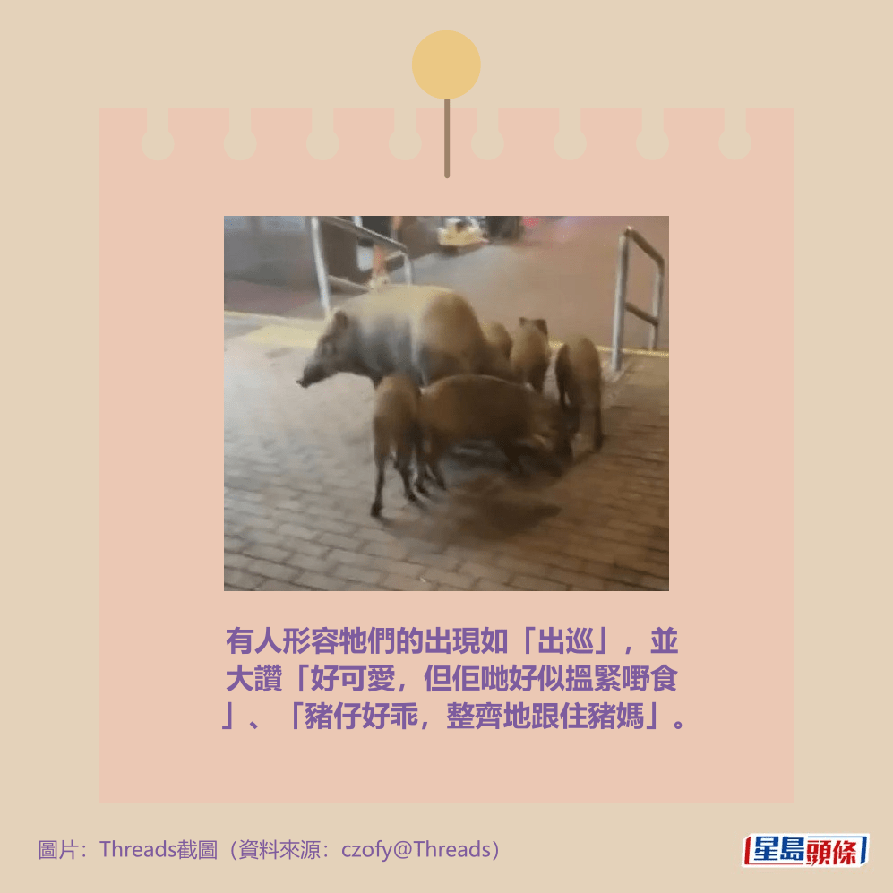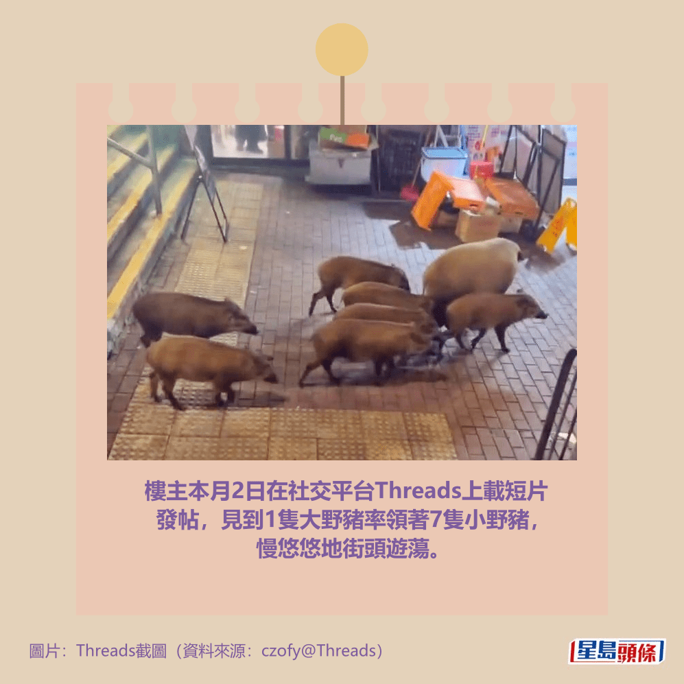 樓主本月2日在社交平台Threads上載短片發帖,見到1隻大野豬率領著7隻小野豬,慢悠悠地街頭遊蕩。