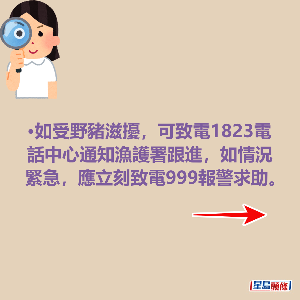 •如受野豬滋擾,可致電1823電話中心通知漁護署跟進,如情況緊急,應立刻致電999報警求助。