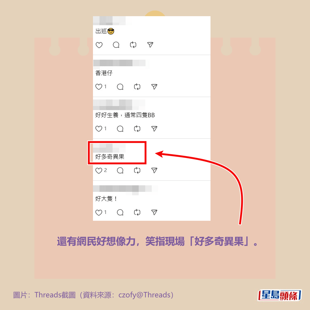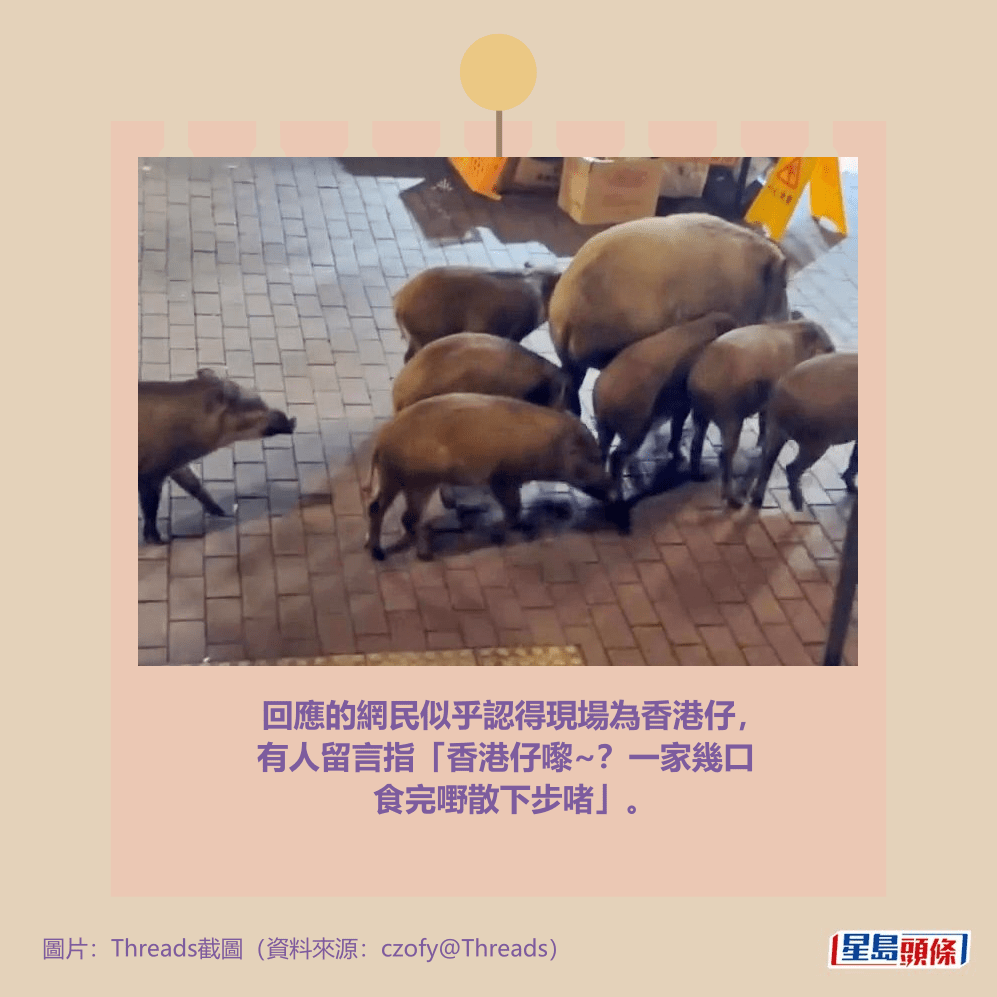 回應的網民似乎認得現場為香港仔,有人留言指「香港仔嚟~?一家幾口食完嘢散下步啫」。有人形容牠們的出現如「出巡」,並大讚「好可愛,但佢哋好似搵緊嘢食」、「豬仔好乖,整齊地跟住豬媽」。還有網民好想像力,笑指現場「好多奇異果」。
