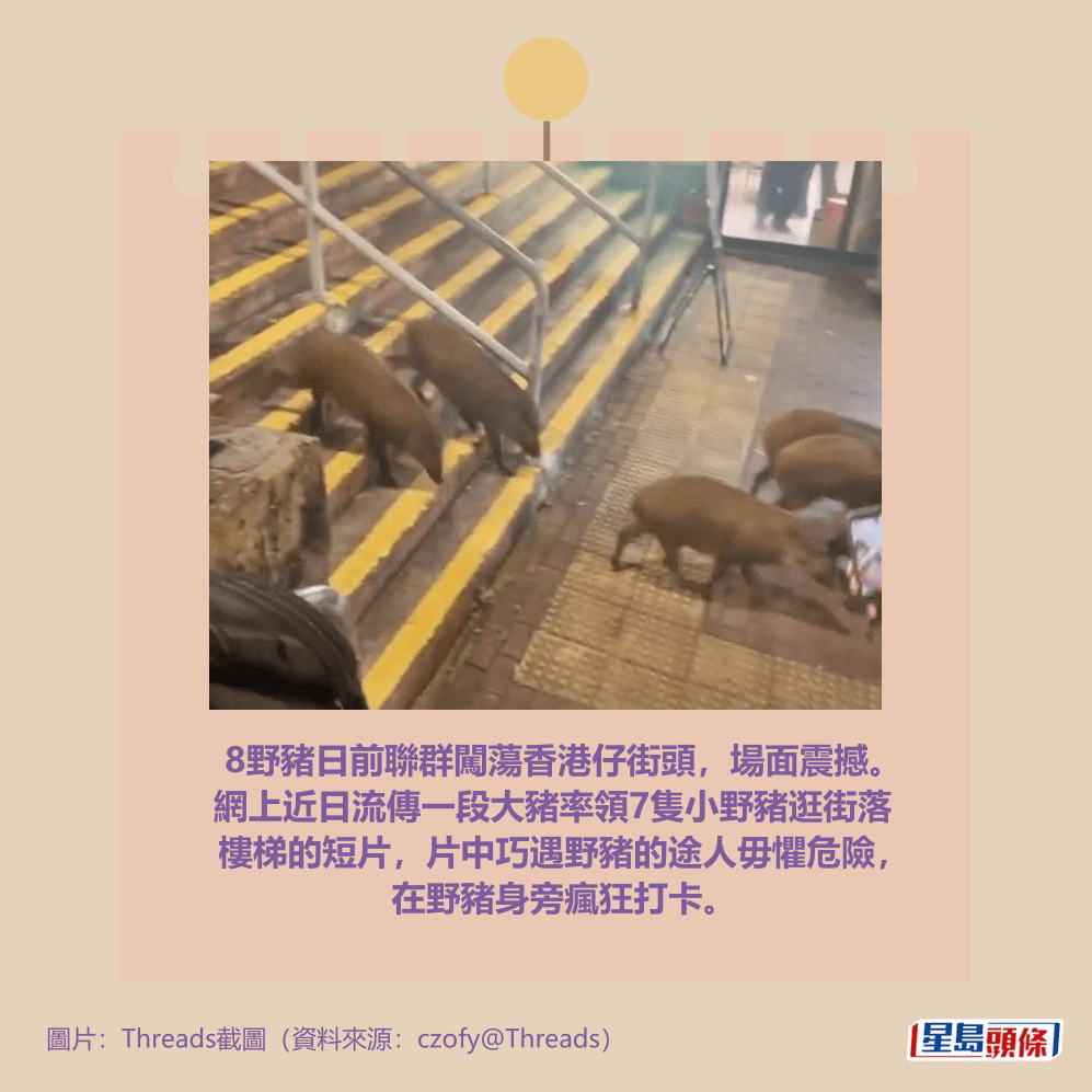 8隻野豬日前聯群闖蕩香港仔街頭,場面震撼。網上近日流傳一段大豬率領7隻小野豬逛街落樓梯的短片,片中巧遇野豬的途人毋懼危險,在野豬身旁瘋狂打卡。詳情見下圖及下文: