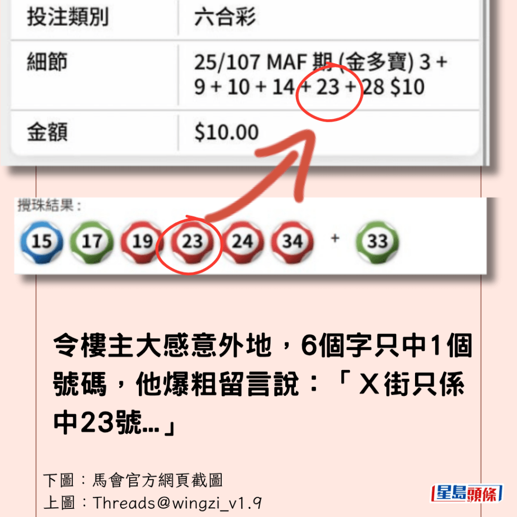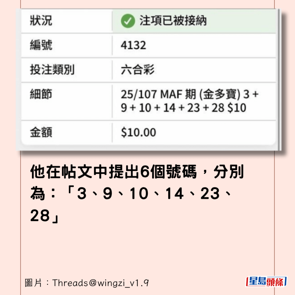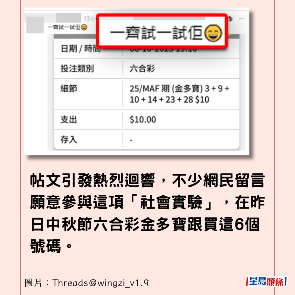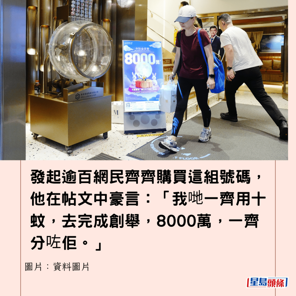 他在帖文中提出6個號碼,分別為:「3、9、10、14、23、28」,發起逾百網民齊齊購買這組號碼,他在帖文中豪言:「我哋一齊用十蚊,去完成創舉,8000萬,一齊分咗佢。」